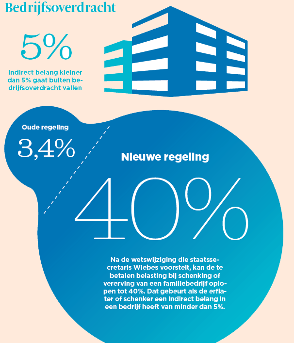 De overdracht van familiebedrijven aan de volgende generatie wordt duurder door een wetswijziging van staatssecretaris Eric Wiebes van Financiën. Het gaat om familievennootschappen die niet in alle gevallen volledig eigenaar zijn van de bedrijven waarin zij ondernemen. In voorkomende gevallen wil de staatssecretaris ondernemersvermogen in deze bedrijven uitsluiten van belastingvrijstelling. Bij schenking of vererving moeten de nieuwe eigenaren daardoor veel meer belasting betalen.